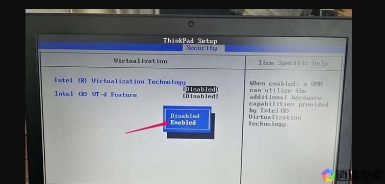 進(jìn)到“Virtualization”設(shè)置界面之后,可以看到“Intel (R) Virtualization Technology”和“Intel (R) VT-d Feature”兩個(gè)選項(xiàng),上面的選項(xiàng)就是虛擬化技術(shù),我們將其開啟就可以使用安卓虛擬器了,下面的選項(xiàng)是定向I/0虛擬化技術(shù),開啟之后可以對虛擬機(jī)使用存儲設(shè)備有提升