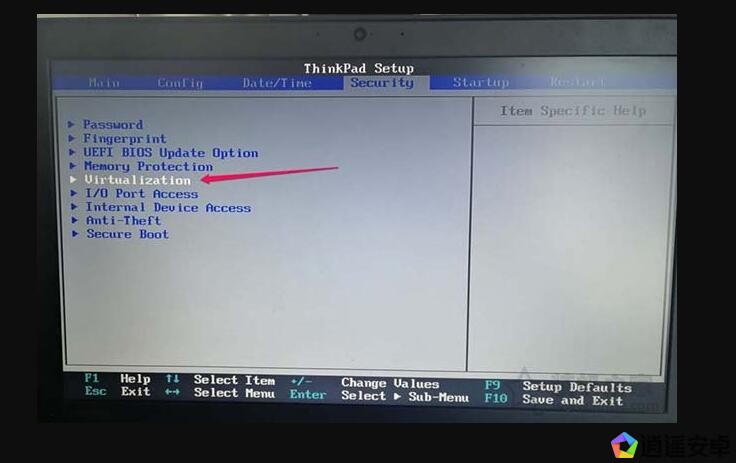 在“Security”界面中,我們進(jìn)入“Virtualization”這個(gè)選項(xiàng)中,這個(gè)選項(xiàng)就是大家需要找的虛擬化選項(xiàng),如下圖所示