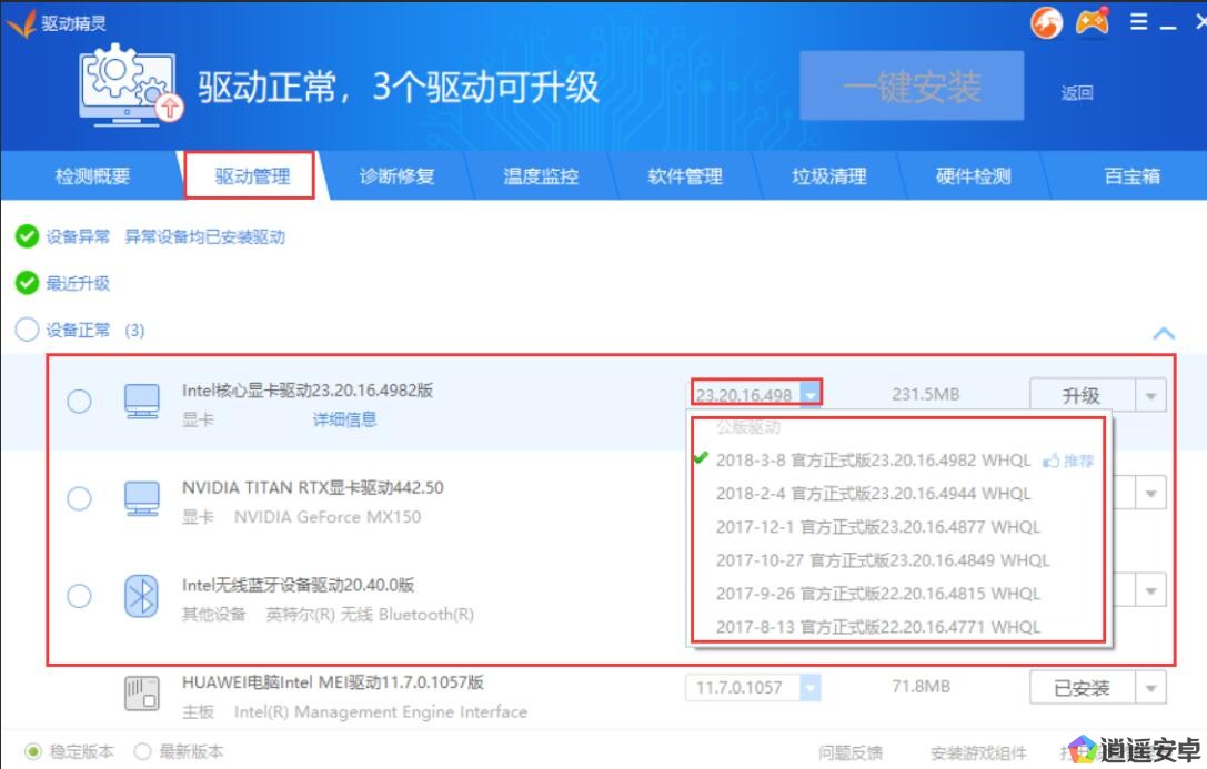 立即檢測 里 點擊“驅動管理”點擊 升級 按鈕,如果沒有更新安裝,就點安裝。