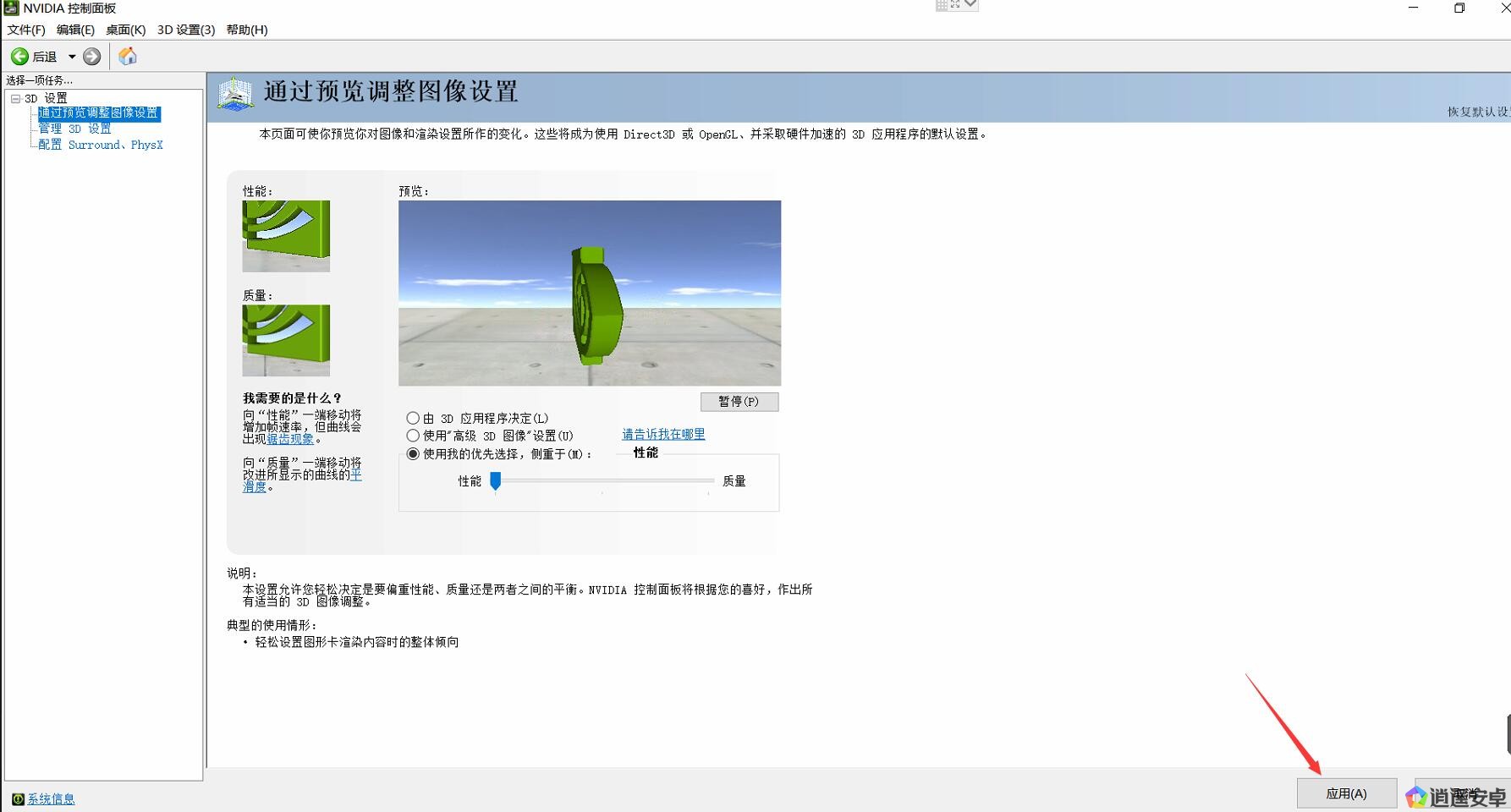 步驟一 :打開NVIDIA顯卡控制面板通過預(yù)覽調(diào)整圖像設(shè)置 選擇 性能應(yīng)用