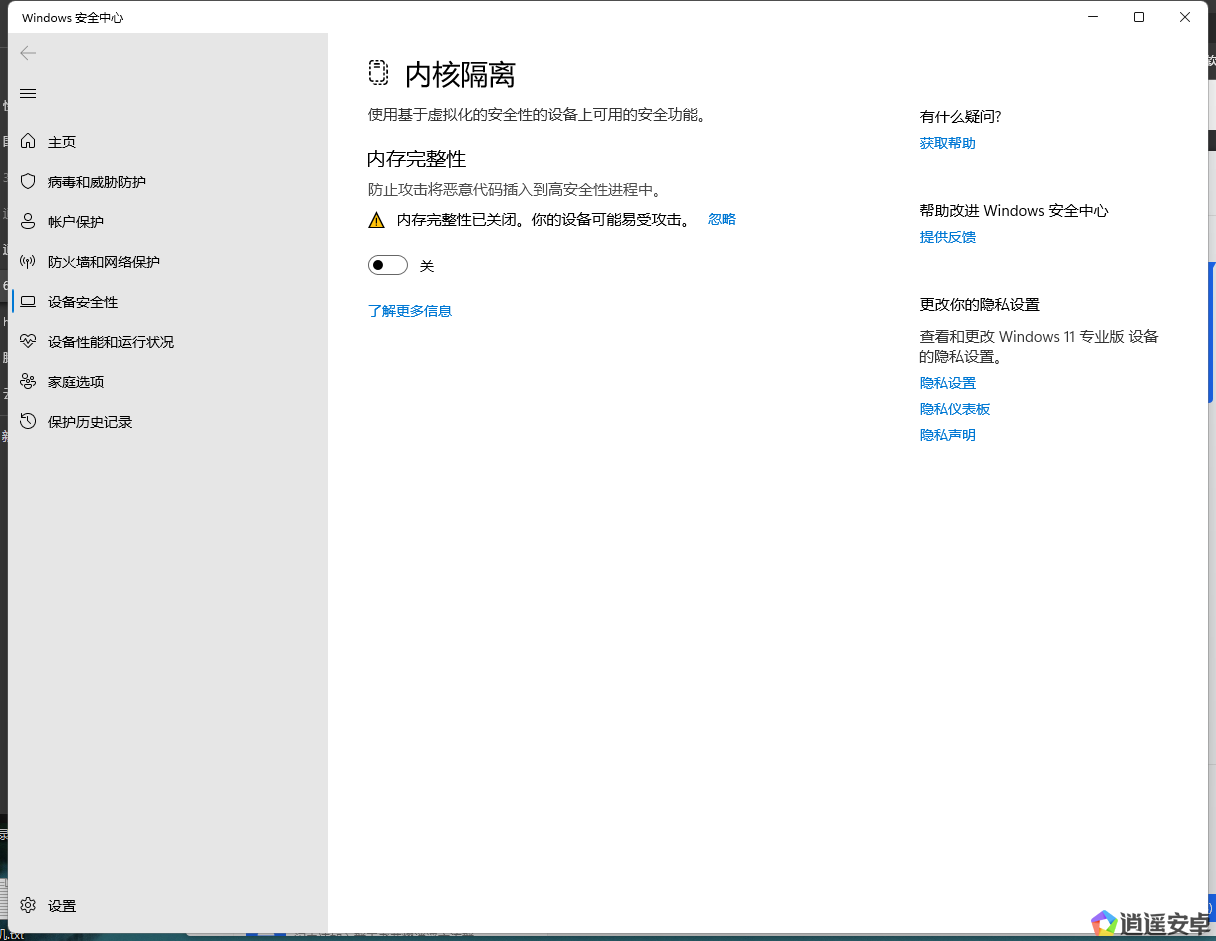 然后把紅框內(nèi)的勾去掉,并將內(nèi)核隔離關(guān)閉即可