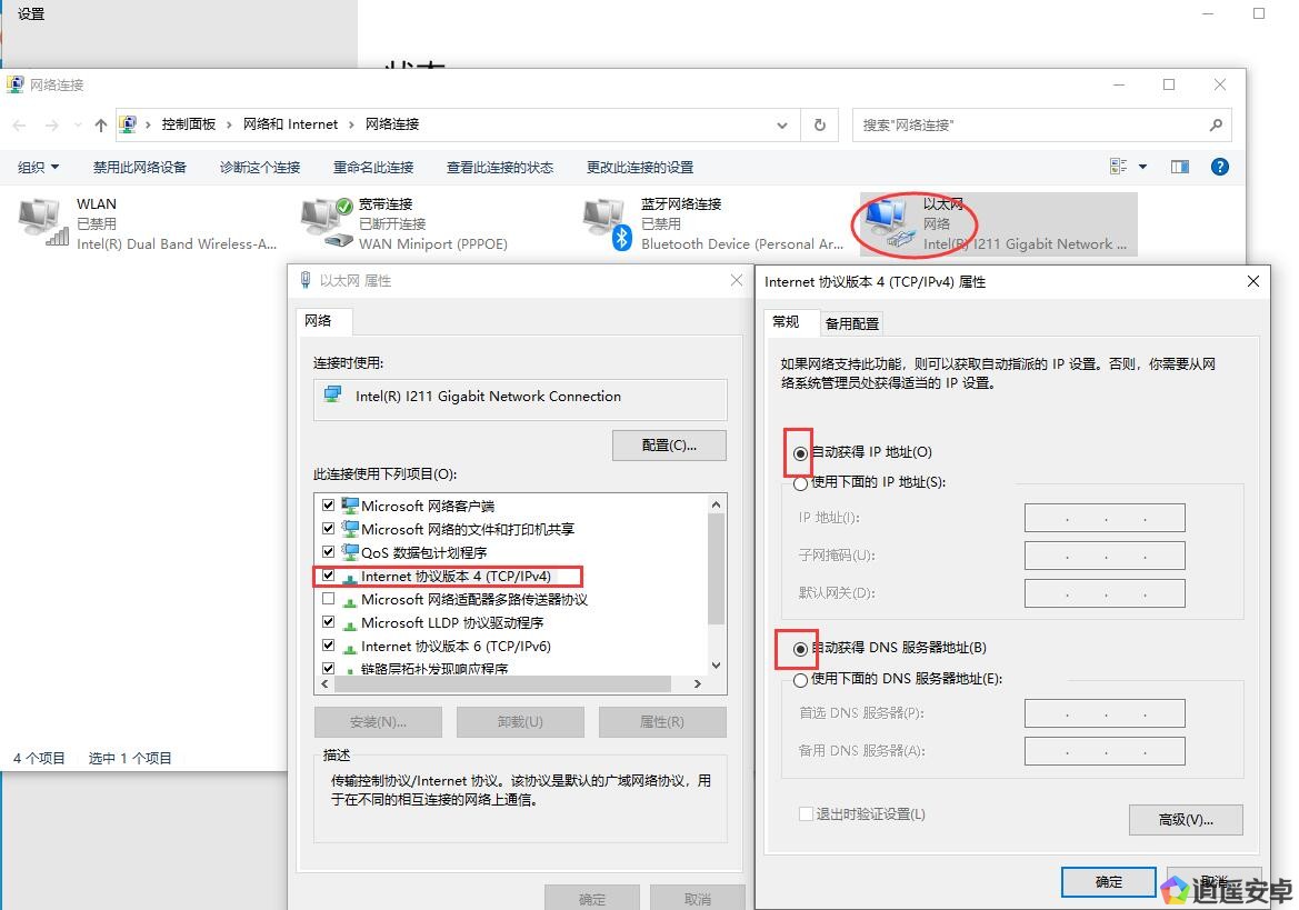 3.找到 你當(dāng)前使用的網(wǎng)絡(luò)網(wǎng)卡右鍵屬性 打開Internet協(xié)議版本4(TCP/IPv4)點(diǎn)擊屬性默認(rèn)選擇: 自動(dòng)獲得ip地址 自動(dòng)獲得DNS服務(wù)器地址 確定