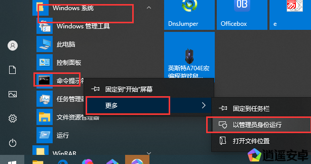 4.開始菜單 里 找到 windows 系統(tǒng)里 命令提示符右鍵更多右鍵以管理員身份運(yùn)行