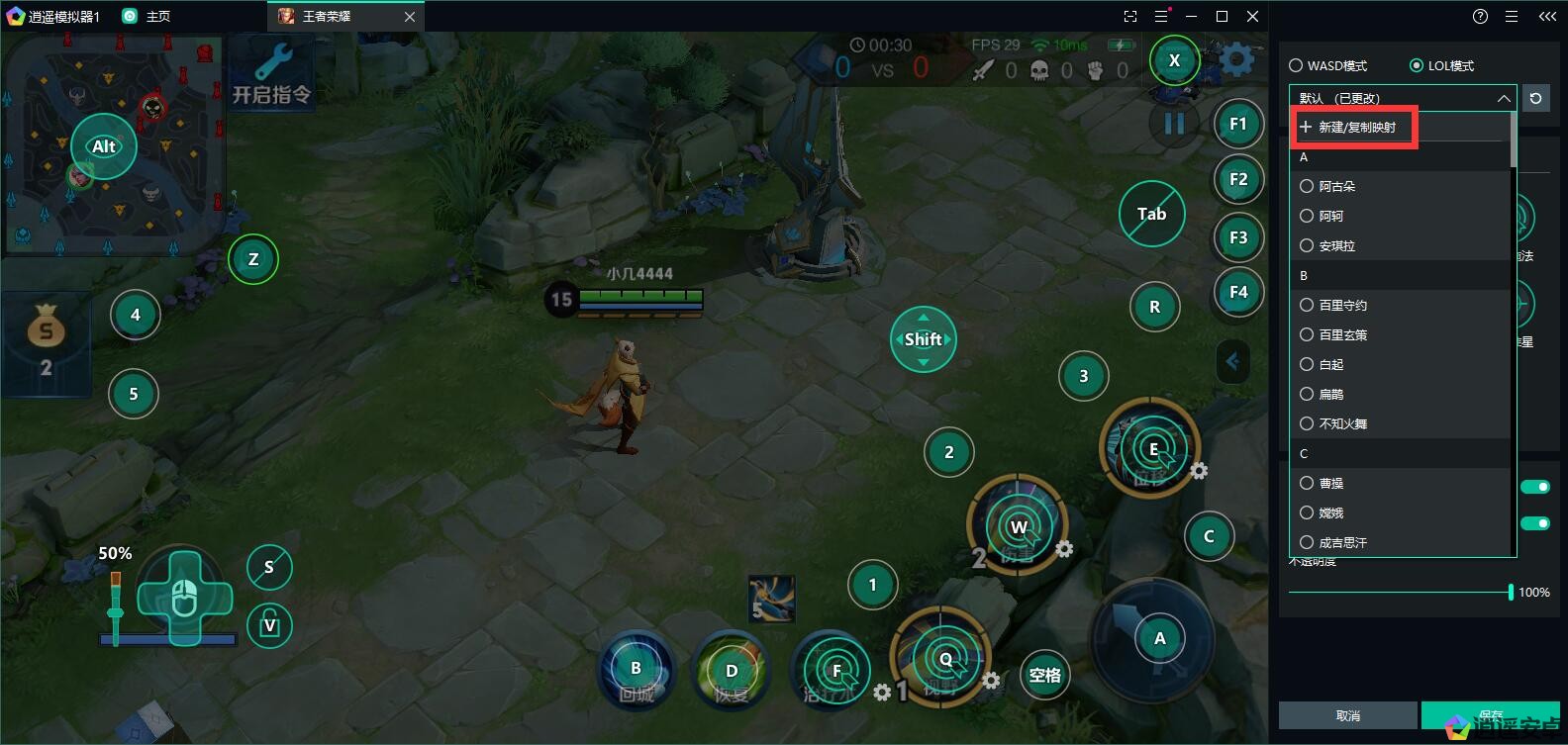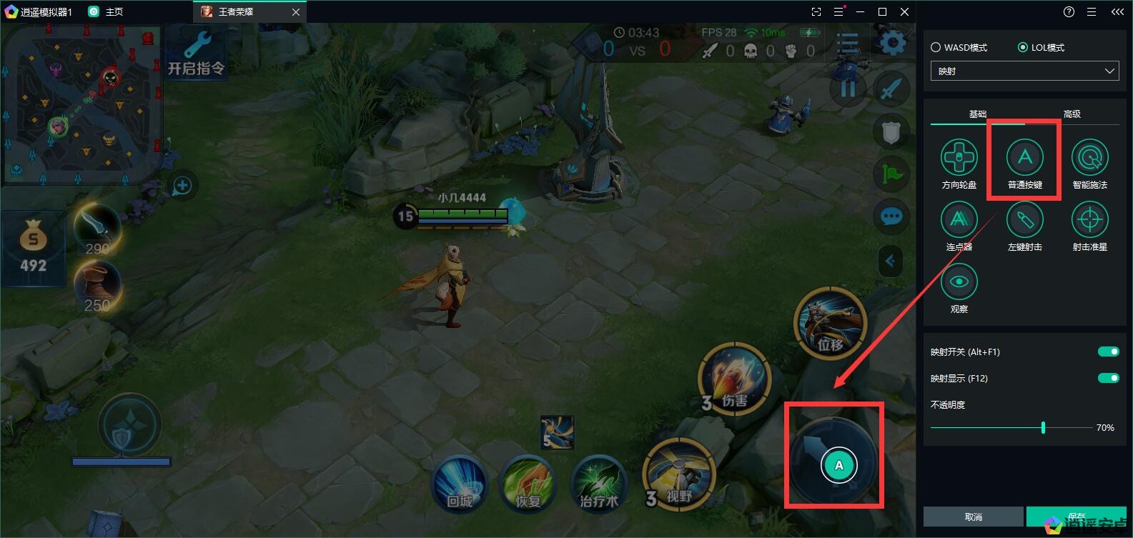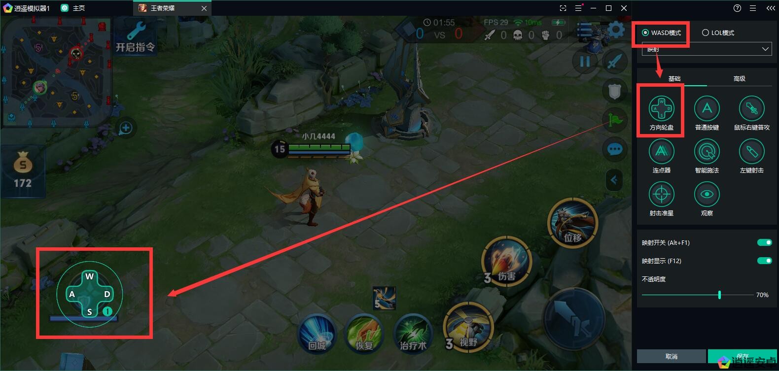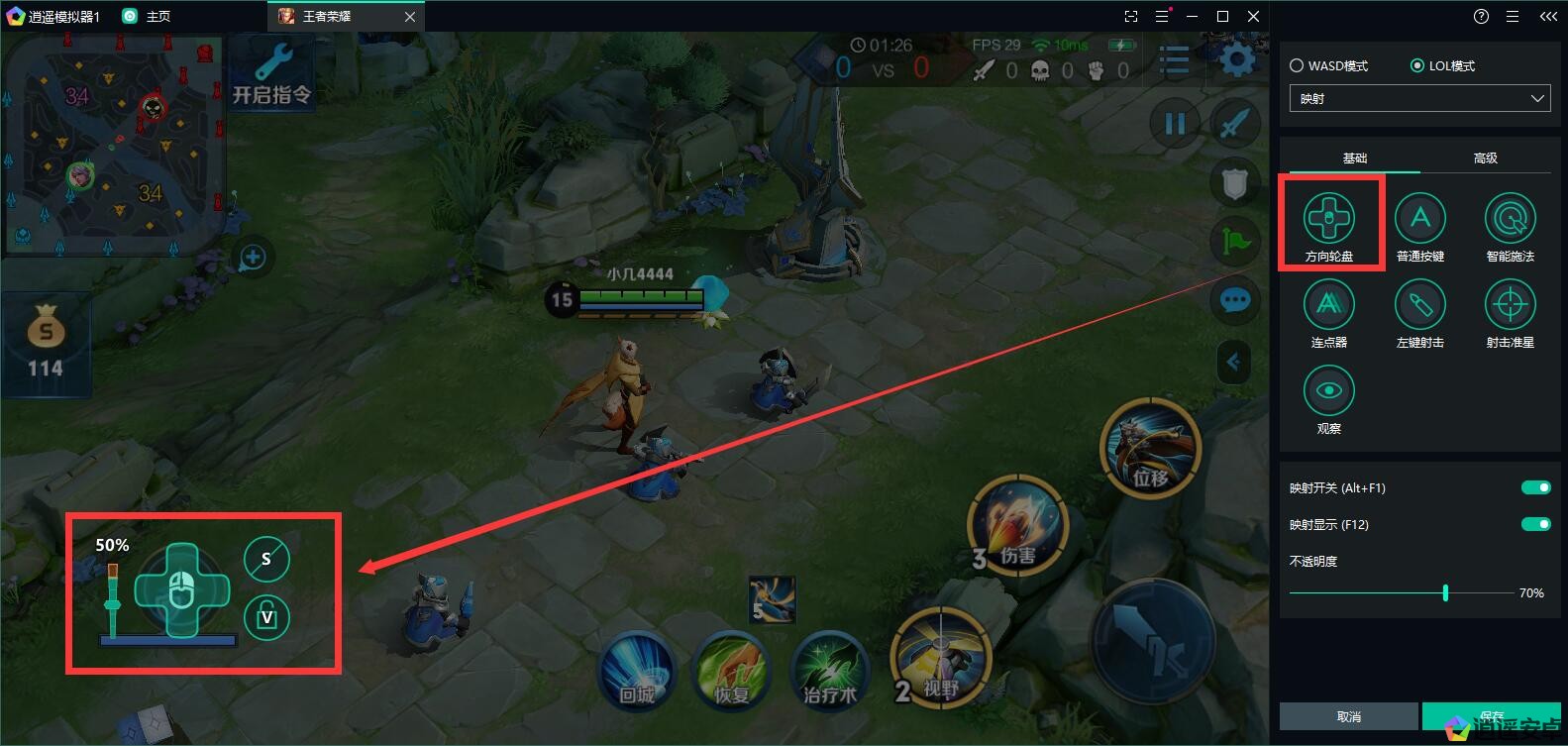 把方向輪盤拖拽到游戲界面的人物移動(dòng)輪盤處,moba游戲默認(rèn)為按住鼠標(biāo)右鍵進(jìn)行走位。