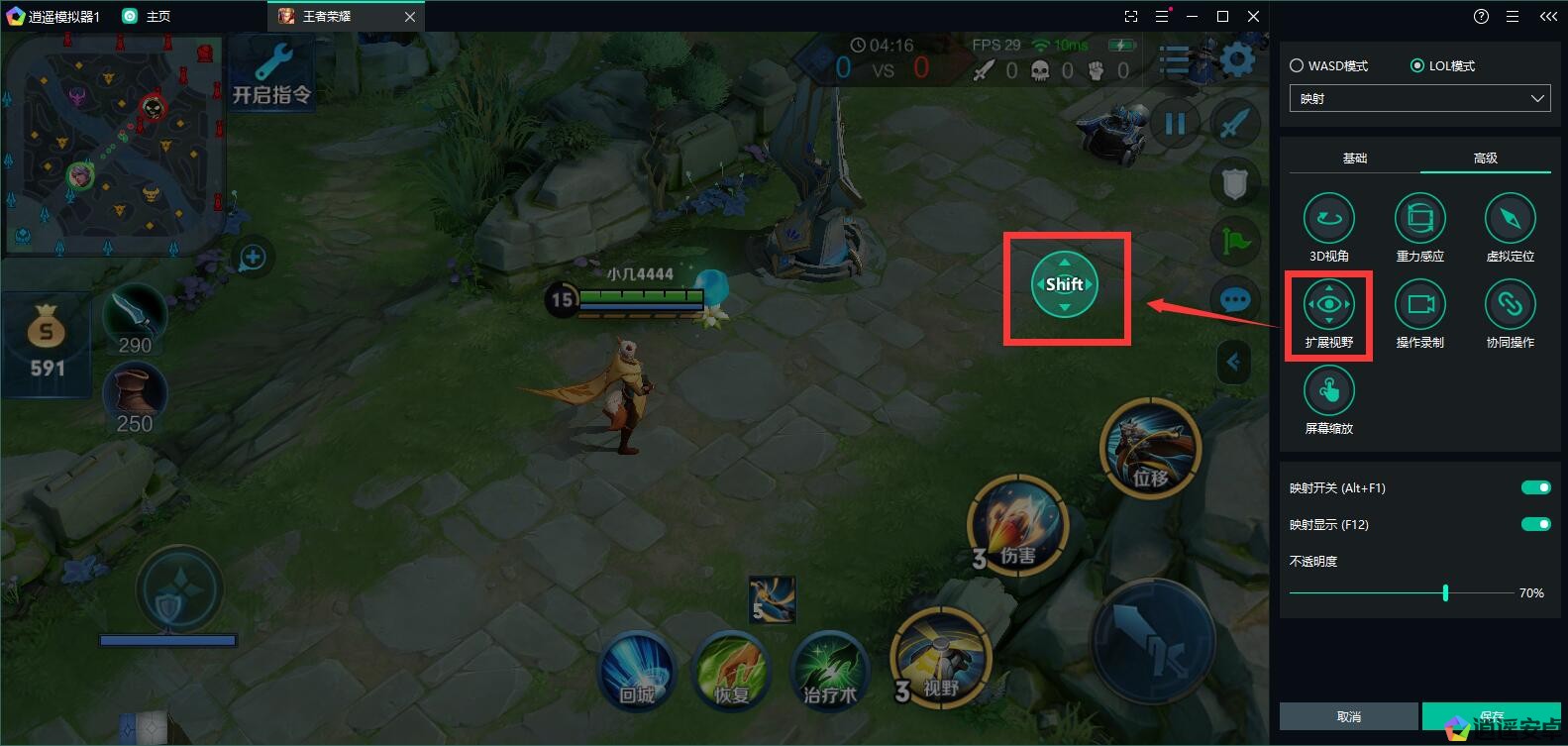 擴(kuò)展視野是moba類游戲的進(jìn)階設(shè)置,把擴(kuò)展視野拖拽到游戲任意界面,移動(dòng)鼠標(biāo)可查看角色視野范圍以外的信息。