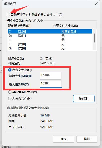 4、在虛擬內(nèi)存頁面中,如自定義大小處為灰色,請先去除上面的勾選項;選擇自定義大小更改為16384MB,更改完成后點擊設(shè)置按鈕,如圖