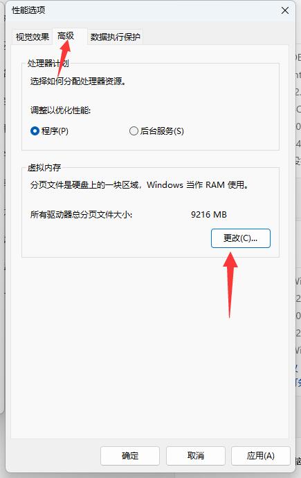 3、進入設(shè)置后,再次選擇性能選項中的高級選項-虛擬內(nèi)存點擊更改,(如圖)