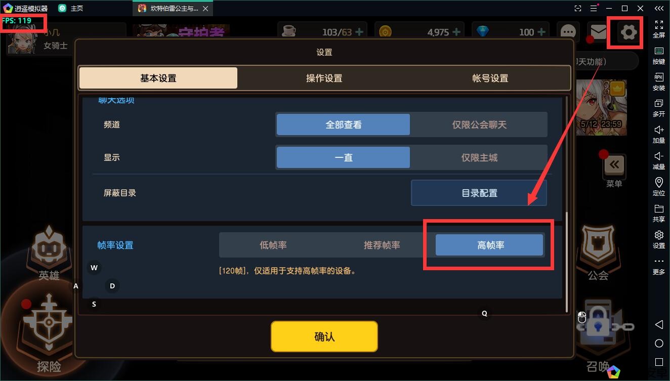 坎公騎冠劍開啟120幀方法 一月 16, 2024 二月 21, 2024 1、打開模擬器右側(cè)側(cè)邊欄“設(shè)置”,在“顯示”中選擇“120幀”模式,點擊確定之后重啟模擬器。2、進入游戲,點開設(shè)置界面,選擇“基本設(shè)置”,下拉把幀率設(shè)置修改為“高幀率”即可。