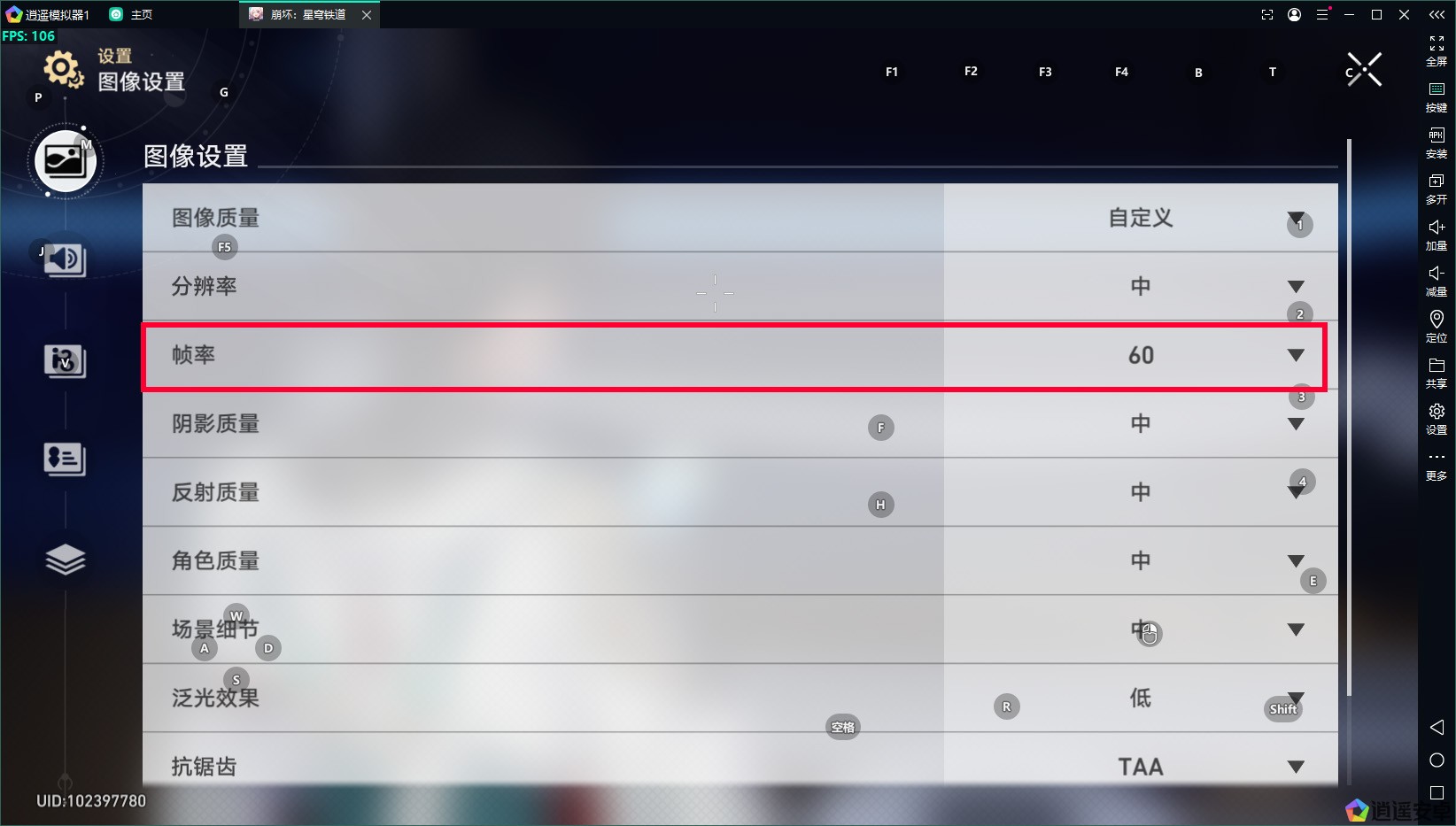 2、在游戲設置界面勾選60幀,實際測試可超過60幀。如果運行卡頓建議關閉高幀率。