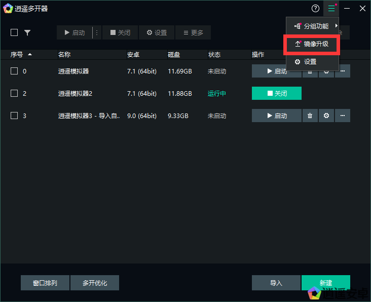 2、如已有安卓9舊鏡像,打開多開器,點(diǎn)擊“鏡像升級”