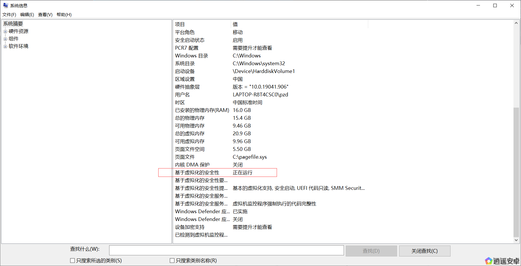 2、在右側(cè)頁面的“系統(tǒng)摘要”下,向下滾動到“基于虛擬化的安全性”,然后確保將“值”設(shè)置為“未啟用”。
