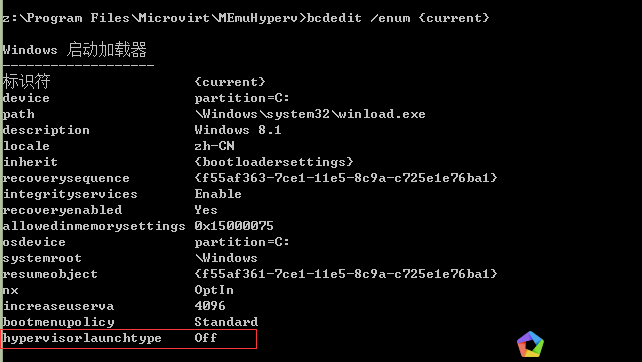 2、以管理員身份打開命令提示符窗口1)運行 bcdedit /enum {current} 記下 hypervisorlaunchtype
