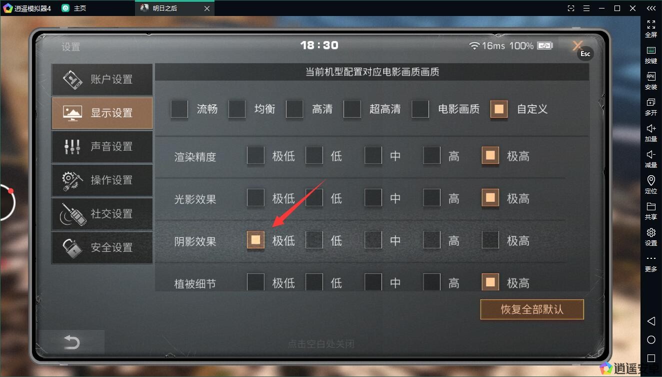 解決方法二:在DirectX模式下,進(jìn)入游戲,在游戲設(shè)置中將”陰影效果”改成極低。
