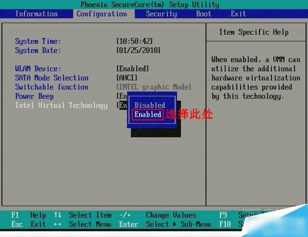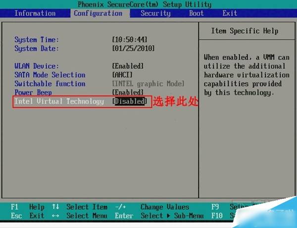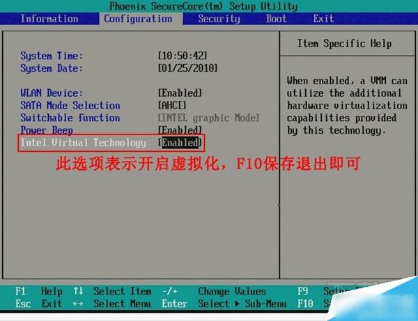 注意:若無(wú)VT選項(xiàng)或不可更改,則表示你的電腦不支持VT技術(shù)。 4、現(xiàn)在直接按鍵盤上的F10,然后點(diǎn)擊確定。這樣就保存了配置。重新啟動(dòng)計(jì)算機(jī),電腦就開啟了VT技術(shù)。