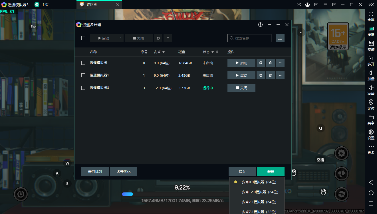 二、模擬器右側(cè)側(cè)邊欄,點(diǎn)擊“多開”,再點(diǎn)擊右下角“新建”,新建一個(gè)安卓12.0鏡像