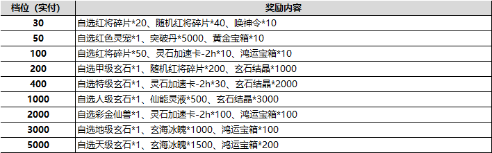 新服首日累計(實付)充值500元:自選紅將碎片*30、隨機紅將碎片*150、喚神令*50