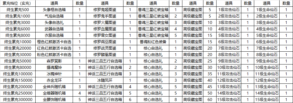 活動(dòng)二、終生累充活動(dòng)(滿足條件郵件自動(dòng)發(fā)放,代金券消耗計(jì)入其中) 活動(dòng)計(jì)算單角色累計(jì)實(shí)付充值,達(dá)到對(duì)應(yīng)檔位需求后即可領(lǐng)取對(duì)應(yīng)檔位獎(jiǎng)勵(lì),每個(gè)檔位僅可領(lǐng)取一次