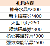 禮包內(nèi)容:核心英雄碎片*50;紅色寶石*1;特級寶石結(jié)晶*50 活動規(guī)則