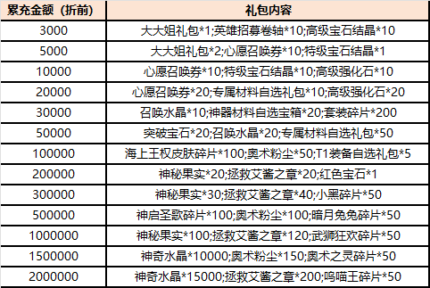 活動內(nèi)容:活動時間內(nèi),玩家累計(jì)充值達(dá)到指定金額(折扣前),即可申請對應(yīng)禮包