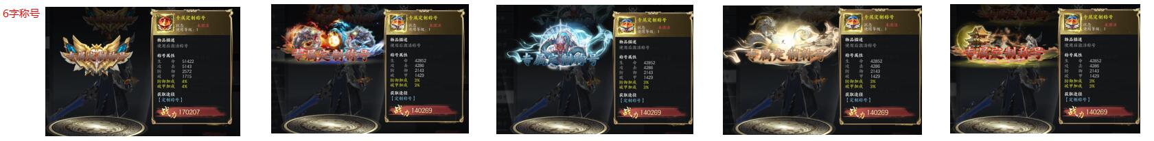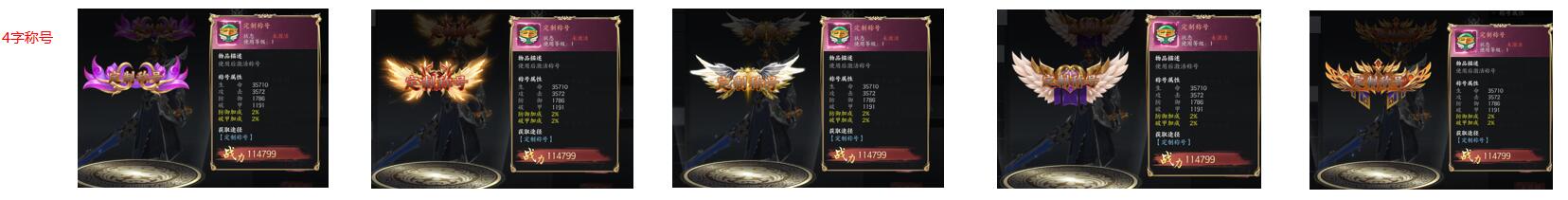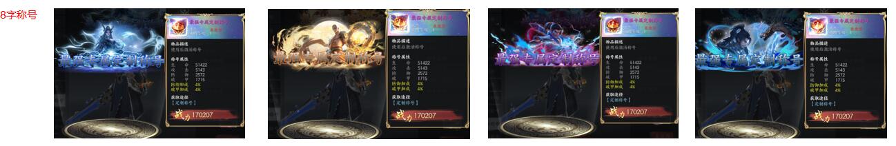 2.定制稱號分為4字、6字、8字定制稱號,定制稱號不能升星,同款式的定制稱號不能疊加屬性,但同時激活多個不同樣式的稱號可疊加稱號屬性