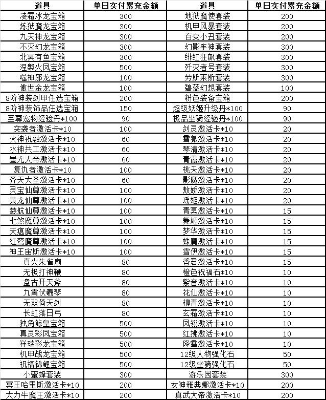 2、單日達(dá)到充值條件(額度足夠情況下可自由搭配等值道具內(nèi)容和數(shù)量)的玩家,選好道具后可向平臺客服申請發(fā)放;