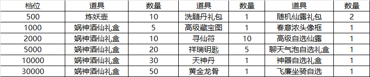 累計(jì)消費(fèi)500:天神丹*1、龍骨*1、仙露自選禮盒*2、真氣丹*5、進(jìn)階丹選禮包*20、高級(jí)藏寶圖*5