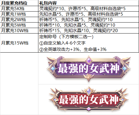 1、累充1W且第一個(gè)聯(lián)系客服登記的玩家,即可獲得對應(yīng)區(qū)服的專屬冠名